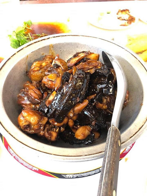 鶏血で固めた餅米と鶏肉の煮込み。胡麻油の香ばしさ。