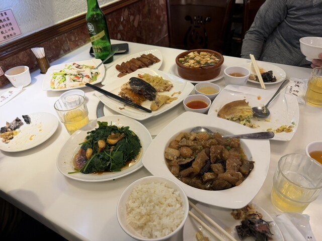 鶏油をかけたご飯のおかずで、定番の鶏肉3種、豚肉の揚げ物、じゃことピーナッツ炒め、ヘチマの炒め物、干し大根の卵焼き、麻婆豆腐、鶏と蛤のスープを頂きました。すべてが台湾の味で美味しいですが、特に、鶏三種...