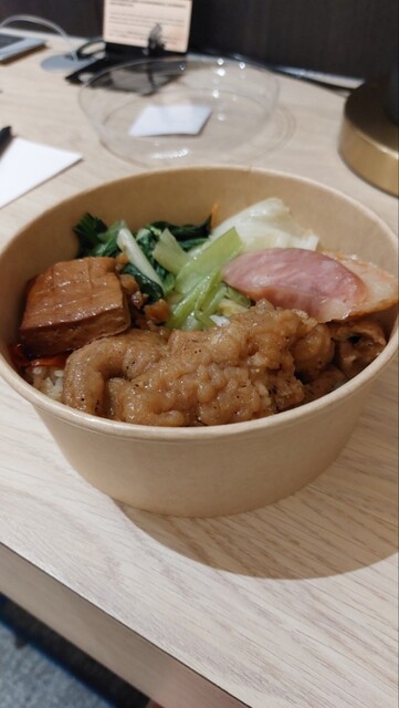 豚肉の排骨メインに腸詰スライスと煮た豆腐、青菜とキャベツのソテーがのっていました