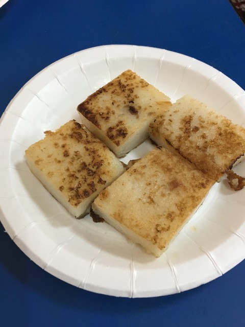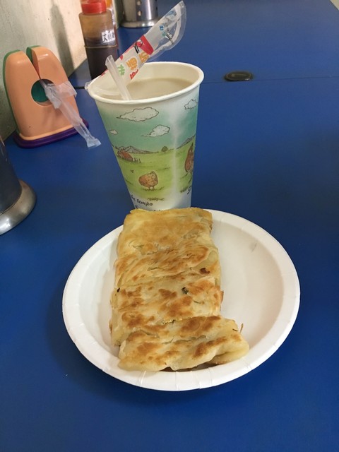 まず豆乳が出てきましたが、でかい。でも良く冷えていて朝から暑い台北の街の厚さを解消してくれるかの様。リフレッシュできます。葱餅はパリッとモチっとしていて軽い食感。テーブルのピリ辛ソースをかけていただくとたちまちスパイシーな味に。大根餅もそのソースをかけていただきます。
