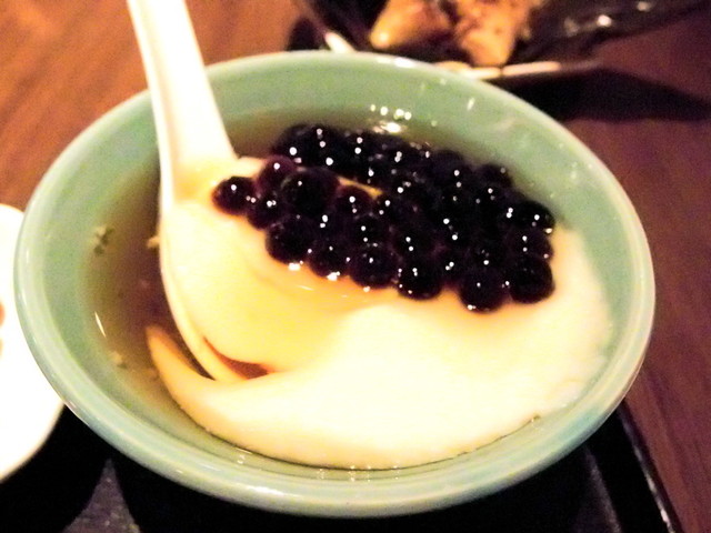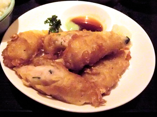 エビのすり身揚げ定食の内容は、エビのすり身揚げ、小皿料理(昆布、豆のサラダ、厚揚げ)、魚肉団子と肉団子のスープ、ご飯、自家製豆腐プリン。