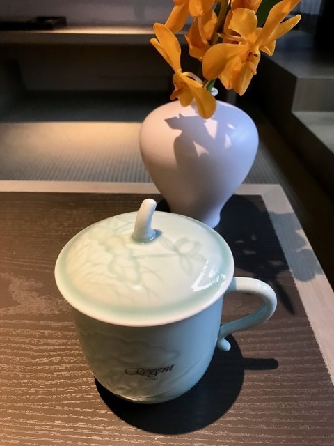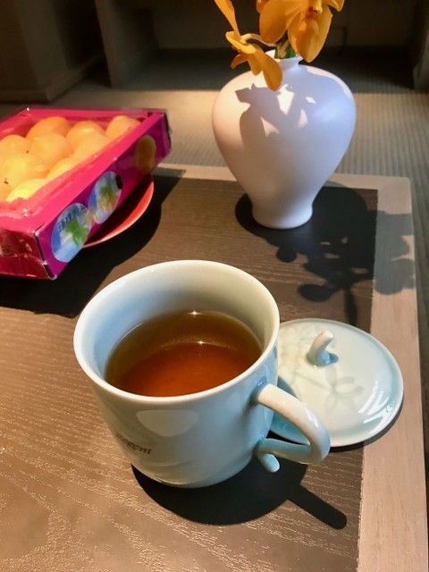 台湾フルーツを両手にぶらさげて歩いてくるとノドが乾いた。というわけでお茶タイム。