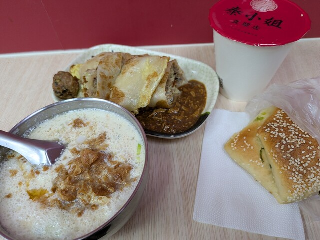 「鹹豆漿(シェントウジャン)」に「蛋餅(タンビン)」にネギ入りのオカズパンに豆乳を注文して800円ぐらいだったっけな。同種のものを東京で楽しめば2千円近くは請求されることでしょう。
