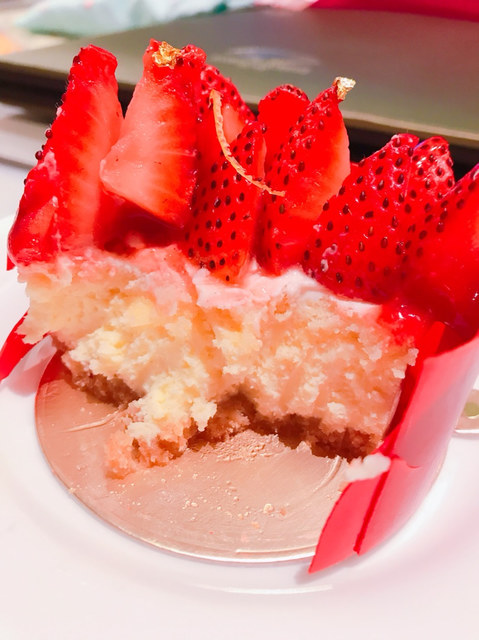 その中でも、周りがいちごチョコレートでくるっと巻かれたいちごのチーズケーキにしました