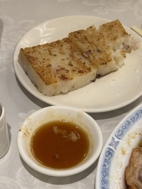 チキンのロースト、大根餅、エビと豚の焼売と、エビ焼売、青菜炒めと少しづついろいろいただきました。