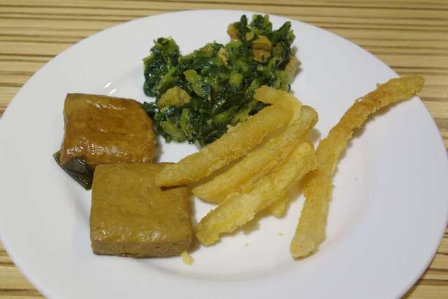 別の日には衣をつけたフライドポテト、干した豆腐の煮物、豆腐と高菜の炒め物を皿に取り