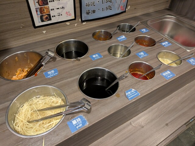 注文を済ませ、セルフの調味料カウンターに向かい、自分好みのタレをクリエイトします。調味料のほか、千切りのショウガや台湾風(?)のキムチもご自由にどうぞ。お茶も部活のデカい水筒みたいな入れ物にたっぷり用意されています。