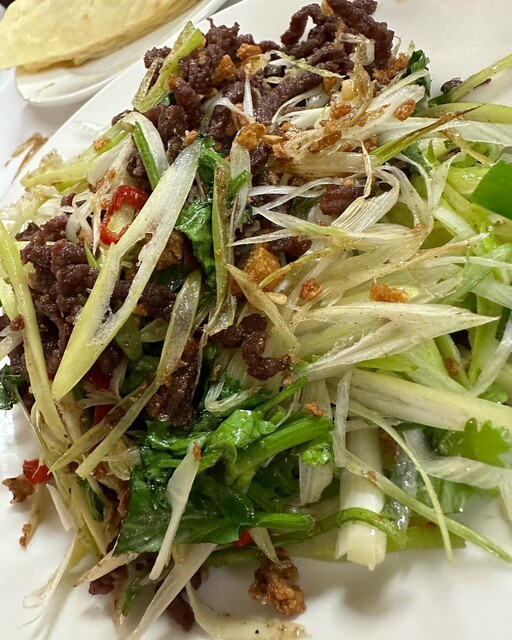 干し牛肉のピリ辛炒めは、パリパリに揚げ炒めたニンニクとネギのパリパリ、これは斤餅に巻くお料理としてはかなり好相性。京醬牛肉絲と並んで、いちばん良かったです。