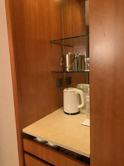備品等も充実、ドリンクも紅茶、緑茶、コーヒー、ミネラルウオーターも毎日1名2本・・・・