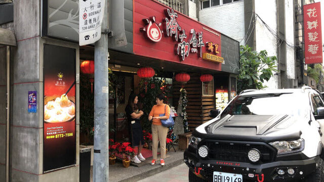 ここを左に曲がって少し進むと右側に「済南鮮湯包」の赤い看板が見えてきます。