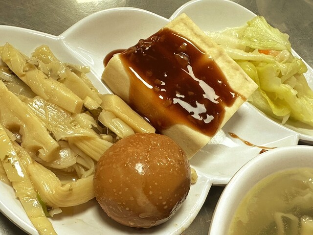 渋い店内。アルミ天板のテーブルが並び、食堂というより工場の休憩所のような素っ気なさだが、清潔感はある。この無骨な食堂感、嫌いではない。注文は紙にチェックをつけるスタイル。台湾は同じようなオーダー方式を採っている食堂が多い。頼んだのは、タクシーのおじさんおすすめの鶏肉飯に、選べるおかず3品と卵焼きが定食のセット。追加で煮卵と、筍と骨付き鶏のスープも頼んでみた。