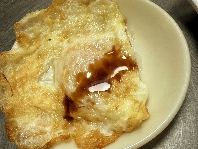 数分で料理が目の前に。プラスチックの器の感じも相俟って、まるで大人の給食のよう。鶏肉飯の鶏はしっとりとして味わい深く、ご飯にかかった激うま甘辛ダレとの相性が最高!そこに両面焼かれた目玉焼きON、とろっとした半熟の卵と絡めて食べると、口の中が旨さの波状攻撃に襲われる。