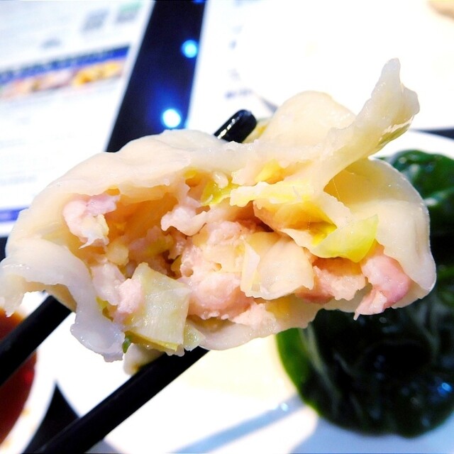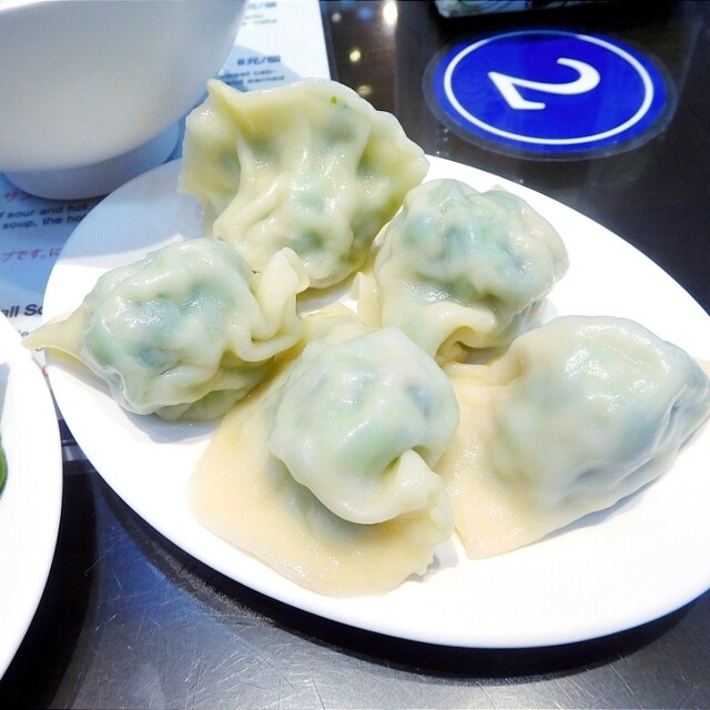 水餃子は3種類。どれもおいしいけれどやっぱり、緑色のほたて水餃子(干貝水餃)が一番。この緑色は海藻を練り込んであって自然なものだそう。わかめみたいな色。水餃子1個にホタテの貝柱が1個、それと豚肉が入ってます。皮はモチモチで厚いです。