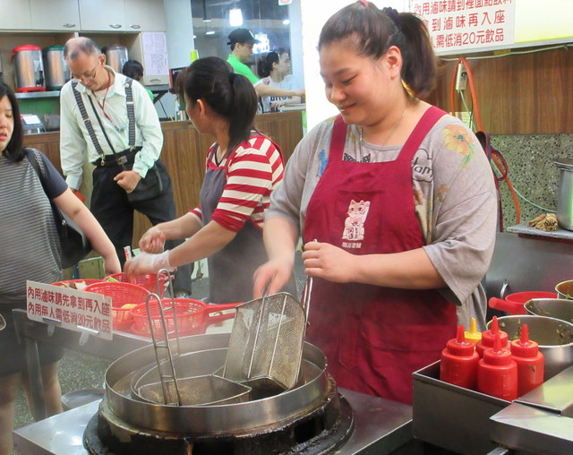 さて、NHKの番組でだいたいの様子はわかっているので、さっそく注文します。川口屋から仕入れているという百頁(高野豆腐/20元)・豬粉肝((豚レバー/30元)・魚蛋(魚のつみれ/20元/3個)・茭白筍(マコモダケ/30元/本)、あとはハツ、ずりなど手あたり次第にカゴに入れて、テレビにも出ていたお姉さんに渡すと、彼女は猛然と煮たっている鍋にそれらを入れ、あっという間に出来上がり。半分以上のお客さんは持ち帰りでビニール袋を手に店を離れますが、我々はここでいただくことにしています。手振りでそれを伝えて、どうやら一人20ドルの飲物を注文する必要があるらしく、お茶をお願いして座ります。
