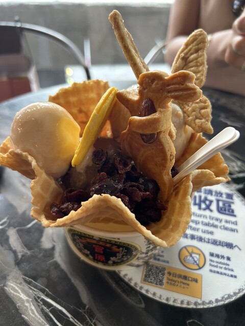 器はワッフルボールで底が深く、アイスが2つとマンゴーフルーツとチーズケーキの豪華アイス盛り。あと蝶々のクッキーを乗せてもらいました。かなり量が多いです...