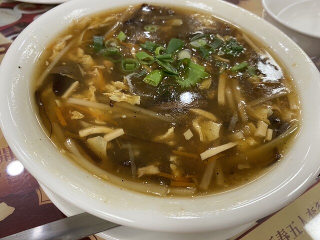 台湾ビールのおつまみには辛味のきいた牛肉とネギのオイスターソース炒め、小籠包、酸辣湯。