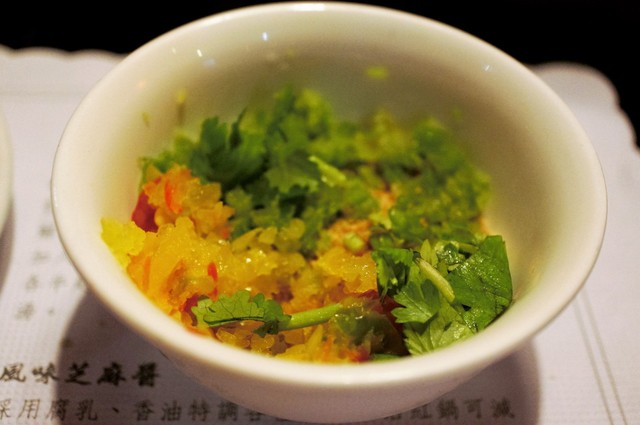 さて、鍋セットがデフォルトとなっていました。セット内容は以下の通り、サラダ、前菜小鉢、お茶、鍋(豆腐、鴨血付)、食後のデザート。
