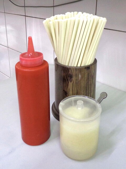 そのままでもイケますが,卓上に常備されたチリソースや おろしニンニクを加えると,パンチが出ていっそう旨いですよ!