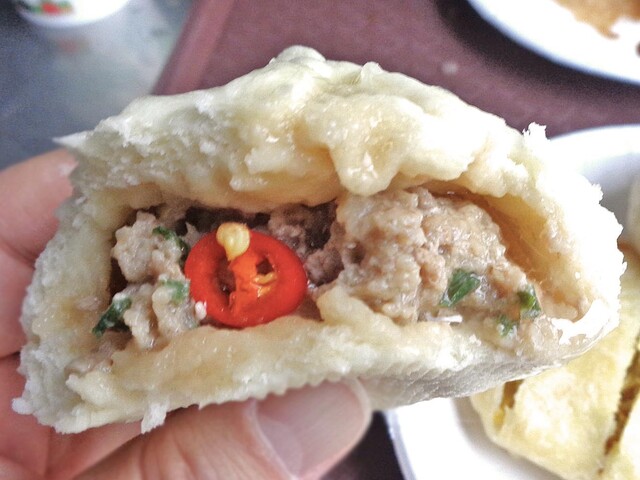 肉餡は,クセが無く,旨みたっぷりです.程々の塩気があるので,そのままで十分イケますね.ただ,卓上に常備されているトウガラシ酢やチリソースをかけると,パンチが出ていっそう旨いですよ!