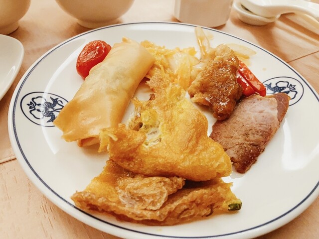 〇注文品…コース(3種のプレート、醤油焼き豆腐、豚肉を巻いた揚げ春巻き、お酢で煮詰めた鶏肉、豆を使って似た蒸し魚、葱オムレツ、しらうとヒユの葉スープ)