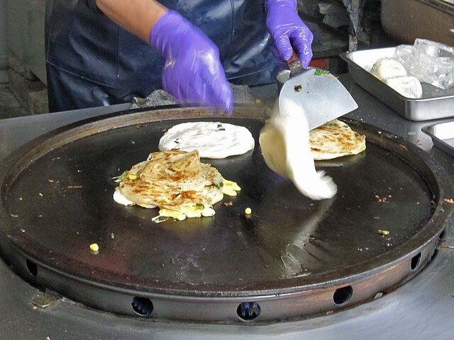 鉄板で焼かれる「葱抓餅」