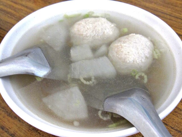 「貢丸湯」は,肉団子とダイコン入りの塩味スープで,小口切りのセロリが浮いています.アッサリ薄味で,セロリの風味がイカしてました.「肉圓」の合いの手にピッタリです.
