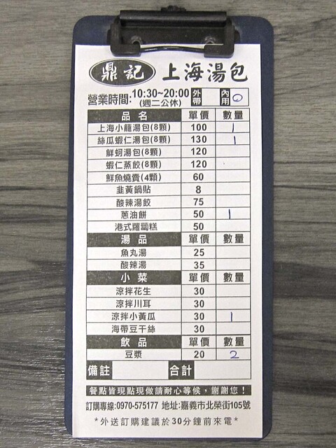 2人でおじゃまして,「上海小籠湯包・8個 100台湾元」と,「絲瓜蝦仁湯包(ヘチマとエビの小籠包)・8個 130台湾元」,「葱油餅(ネギ餃子)50台湾元」,「涼拌小黃瓜(冷たいキュウリの和え物)30台湾元」を注文しました(1台湾元=約5円;2026年1月現在).