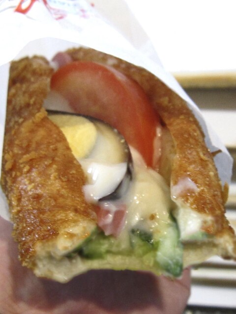 パンは,揚げ立てでアツアツです.表面サク・ザク,内部フンワリ・ムッチリでした.煮卵やハムの塩気と,甘目でヨーグルトのような風味の台湾マヨネーズが良く合いますね.野菜類のフレッシュ感もイカしてました.