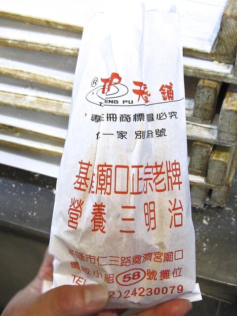 「營養三明治」は,1個ずつ紙袋に入っています.パン粉を付けて揚げたドッグパン(コッペパン?)に,煮卵・ハム(ソーセージかも)・トマト・キュウリ・台湾マヨネーズがサンドされていました.