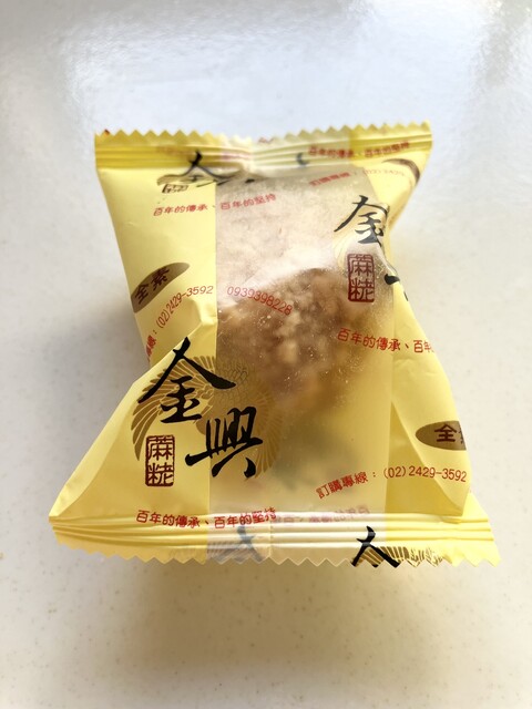 金興蔴粩は、外側はピーナッツで覆われていて内側は水飴のような白い繊維状の塊。