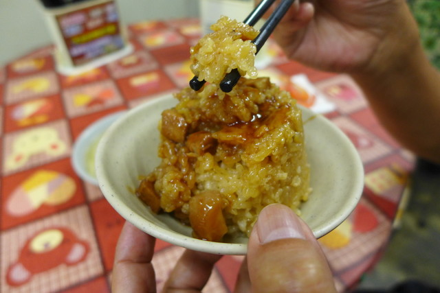 お馴染み「米糕」(TWD25)は、少し柔らかめに炊いたもち米おこわに、刻んだ豚肉の甘い餡をかけてある。