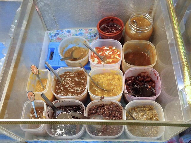トッピングが15種類くらいあり,3種類を選ぶことができます.自分は 桑椹・鳳梨・紅豆 を,連れは 桑椹・鳳梨・梅子 を選択しました.