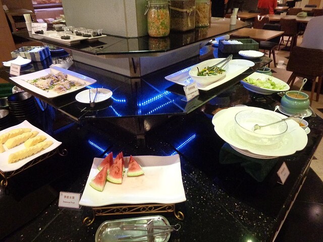 『鮮肉湯包』と『新竹有夠燗花生湯』で朝食を食べたため,こちらではハム,フルーツ(スイカ・パイナップル),飲み物(オレンジジュース・コーヒー),ヨーグルトのみをいただきました.普通に旨かったですね.