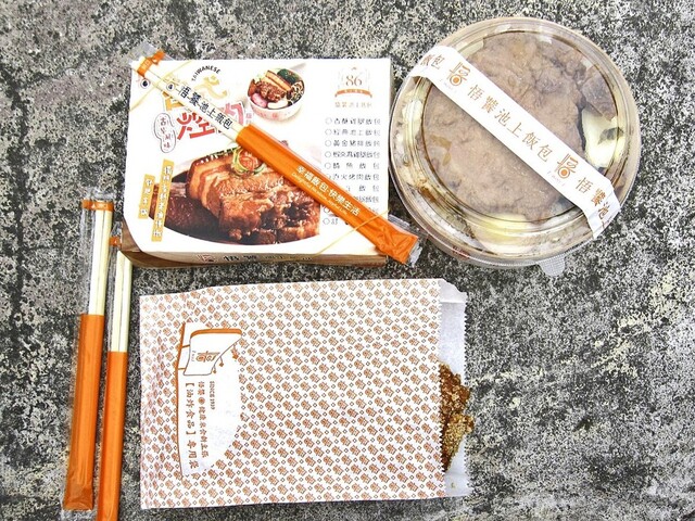 「悟饕經典排骨飯」と「悟厚大G排飯包」は,メイン以外はほぼ同じだったと思います.前者のメインは大振りな豚骨付き肉の煮物(トッピングの一部)で,後者のメインは大振りな取り唐揚げ(揚げ立て;袋入り別添え)でした.ご飯には,キャベツ炒め・青菜炒め・高菜漬け・豆干(干し豆腐)の煮物・煮卵・台湾ソーセージ・ガリ(?)・奈良漬け(?)等がトッピングされています.