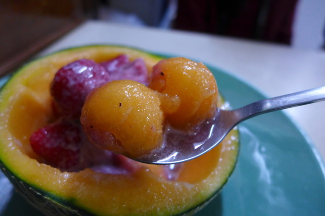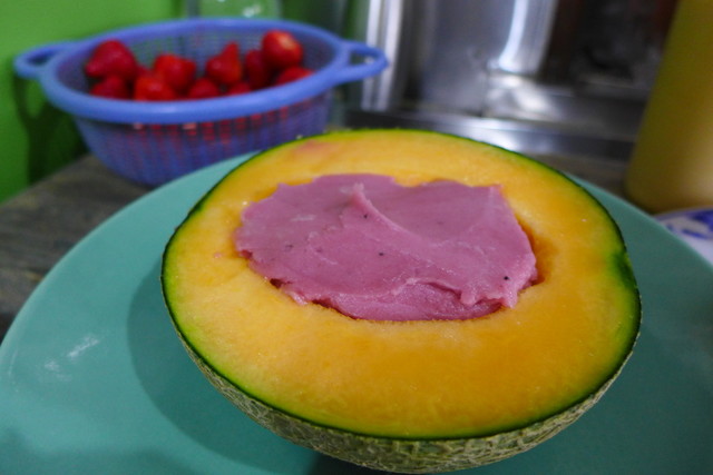 哈密瓜の種をくりぬき、苺シャーベットで穴を埋めて・・・