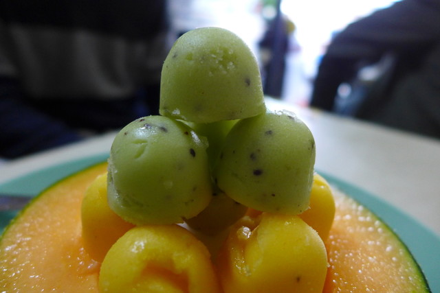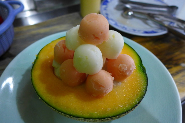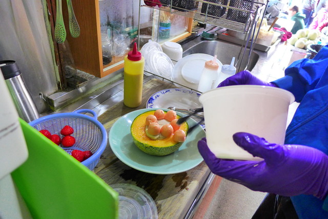 人気なのは、哈密瓜(メロン)の半割を大胆に使って、種を刳り抜いたところにシャーベットを詰め、新鮮な草苺、それに葡萄や哈密瓜のシャーベットボールを並べるメニュー。