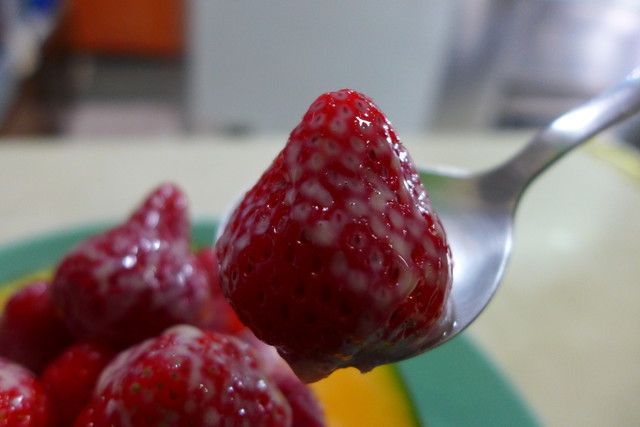 まず、すっすらと練乳がかかったイチゴは瑞々しく、日本の苺と大差ありません。