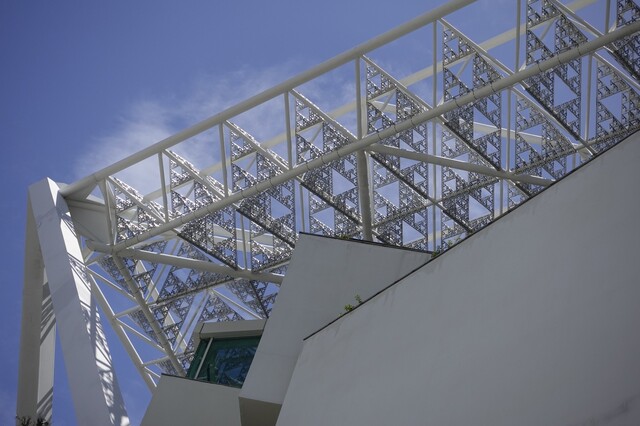 石昭永と坂茂建築事務所設計の現代美術館で、フラクタル構造の屋根が、陽が当たる角度によって木漏れ日のような光が館内に差し込みます。