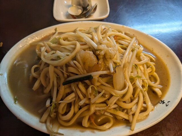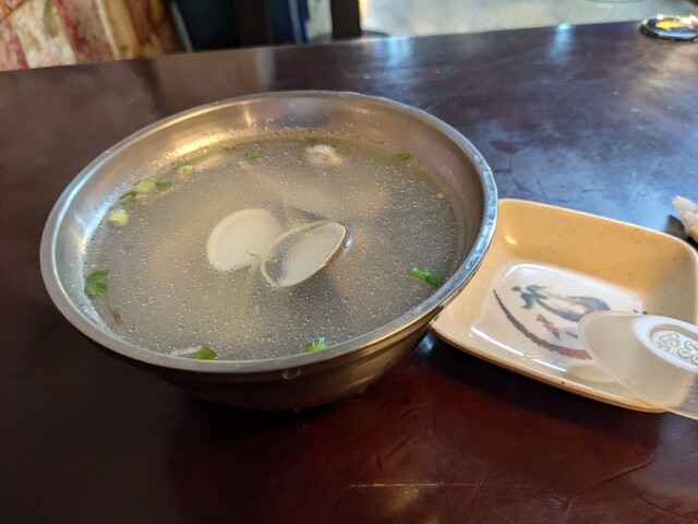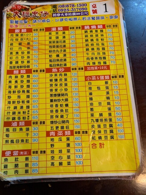 海鮮炒麺60元と蛤蠣湯40元に印を付けて店頭...