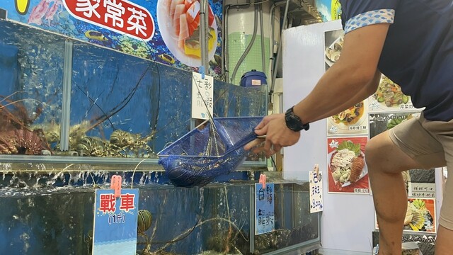 店頭にいくつも水槽が並べられ、その中に巨大なエビやら魚やらが入っています。
