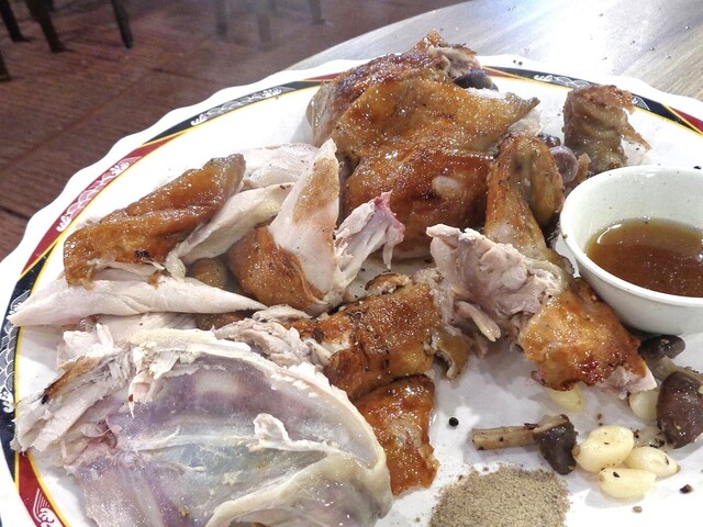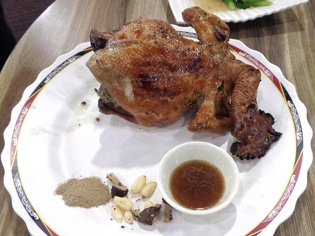 「甕窯雞」は,内臓を抜いた鶏の丸焼きです(頭やトサカも付いています).こちらも,3〜4人分くらいのボリュームでした.焼きニンニク・焼きシイタケ・鶏油(丸焼きの際に出たものと思われます)・スパイス塩が添えられています.また,手が汚れないよう,ビニル製の手袋も一緒に運ばれてきました.