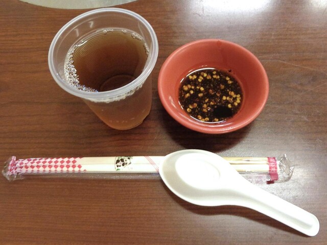 客室の一角に調味料類が常備されており,それらを使って好みのタレを作ります.自家製辣油が辛いのでご注意ください.でも,そのパンチがクセになりますよ.