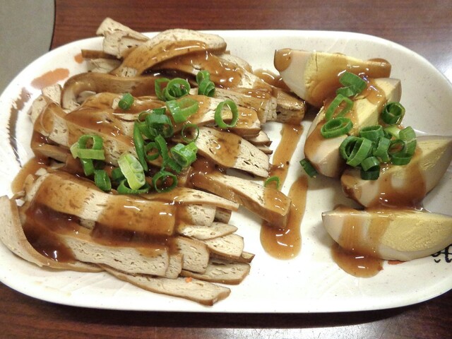 2人でおじゃまして,「韭菜水餃(ニラ水餃子)1粒5台湾元」×15粒と,「青菜貢丸湯(青菜と肉団子のスープ)35台湾元」,「豆干(干し豆腐の煮物)20台湾元」,「滷蛋(煮卵)15台湾元」を注文しました(1台湾元=約4.7円;2024年4月現在).