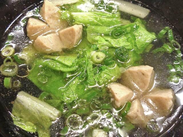 「青菜貢丸湯」には,切り目を入れた貢丸(肉団子)とサッと火を通したレタスが入っており,小口切りのネギがトッピングされています.貢丸のムッチリ食感と,レタスのシャキシャキ食感が楽しかったですね.