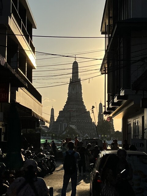 川の向かいにはワット・アルン。沈みゆく夕陽が灼熱の一日の終わりと妖しさと賑々しさに少しの清らかさを混ぜた夜の始まりを告げる。