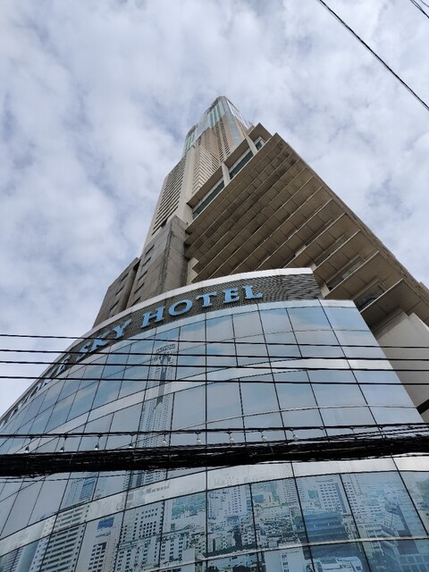 タイ・バンコク出張のホテル朝食です。スワンナプーム国際空港から1本で行けるRatchaprarop駅から徒歩3分くらいのバイヨーク スカイ ホテルの78階に当店はあります。