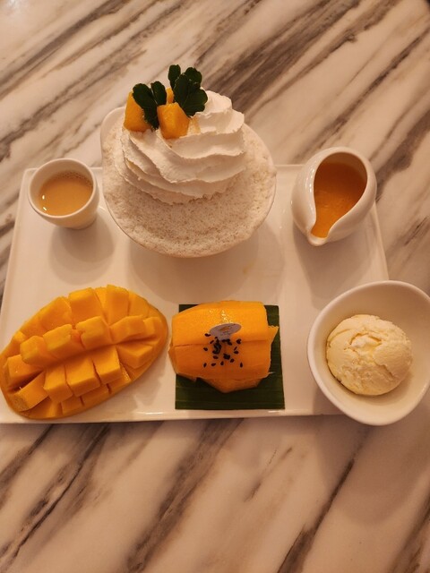 台湾ではカキ氷が定石だが、タイでは《マンゴー•スティキー》練乳かけて“The Tha...