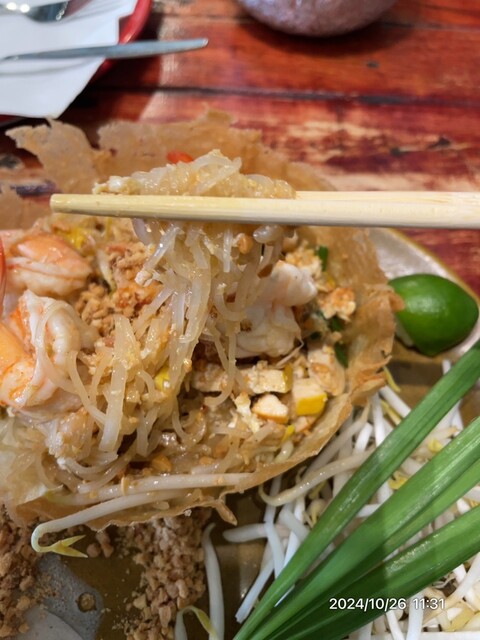 具がゴロゴロ入っていて、パッタイを入れている器も食べれてパリパリで美味しいです!