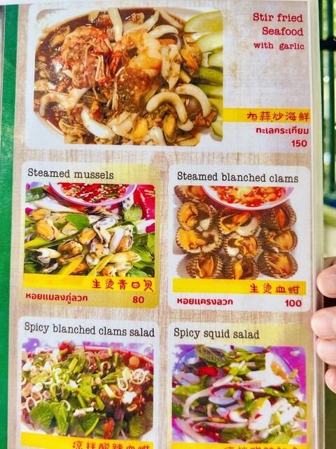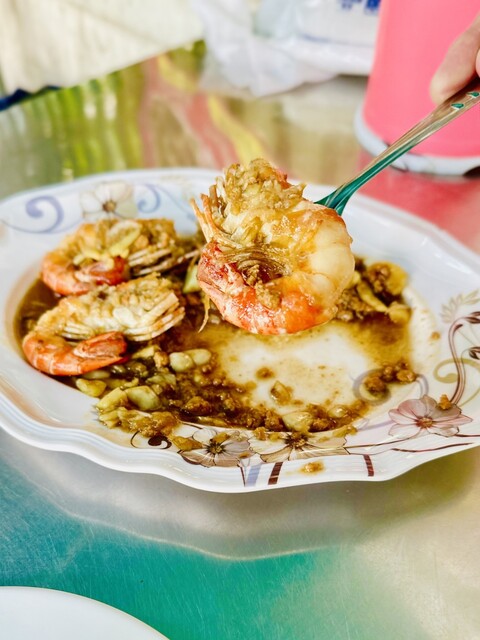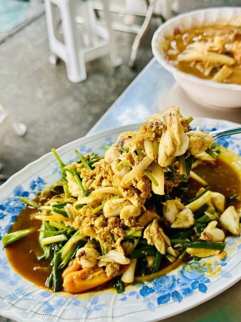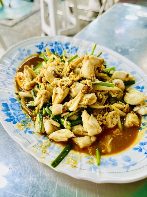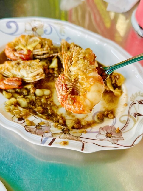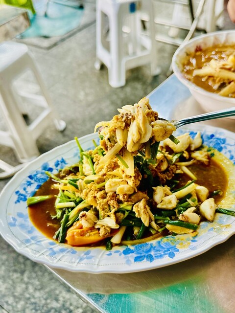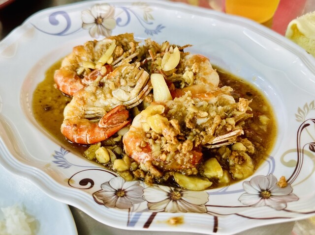 続いて「ヌアプーパッポンカリー」は、カニの身がどっさり使われているカレー風味の炒め物で美味しかった!タイではカジュアルに食べられている蟹を使った料理で必食価値あり!最後にスタッフオススメの「海老のニンニク炒め」も美味しかった!大きな海老に海老味噌がたっぷり溶け出していて、ニンニクと海老味噌が混ざり合って最高に美味しい♡ビールに最高〜オススメの逸品料理だと思います。