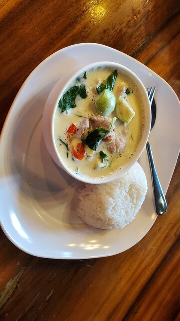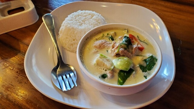 プリプリなチキンに、程好いスパイシーで具沢山なグリーンカレー。観光地のお店にしては、お値段もそこまで高くないので良いのではないかしら((o(^∇^)o))